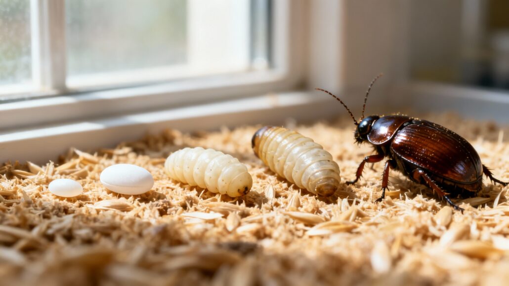 Todo comienza con el huevo. Es diminuto, de forma ovalada o arriñonada, con un color blanco lechoso y una longitud que apenas alcanza los 1,5 a 2 mm. Su superficie está cubierta por una sustancia pegajosa que le permite adherirse a las partículas del sustrato, camuflándose y protegiéndose. Una hembra adulta sana puede poner entre 300 y 500 huevos a lo largo de su vida reproductiva, depositándolos de forma individual o en pequeños cúmulos.